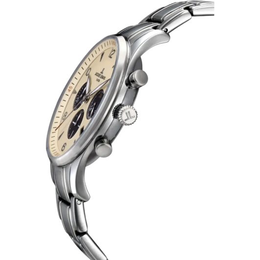 Бежевый циферблат с черными субдисками создает интересный контраст и обеспечивает отличную читаемость времени и дополнительных функций, добавляя часам глубины и стиля. Стрелки с люминесцентным покрытием позволяют легко определять время даже в условиях недостаточной освещенности.