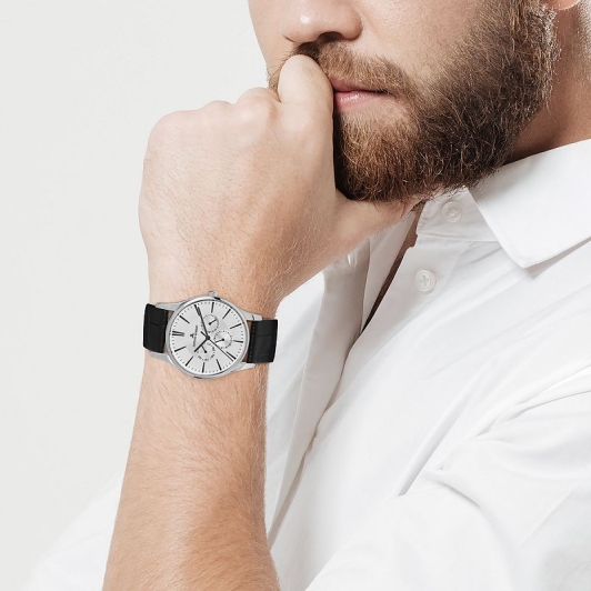 Ремешок из натуральной черной кожи – это символ элегантности и комфорта. Он идеально облегает запястье и прекрасно сочетается с любым стилем одежды, от делового костюма до повседневного образа. Чистый белый циферблат обеспечивает отличную читаемость времени в любых условиях освещения. Четкие метки и стрелки выполнены в контрастном цвете, что делает считывание информации максимально удобным.