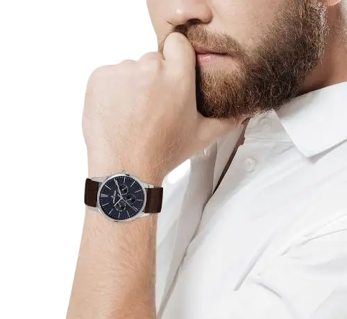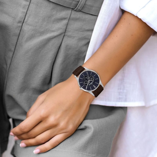 Ремешок из натуральной кожи коричневого цвета приятно облегает запястье, обеспечивая комфортное ношение в течение всего дня. Коричневый цвет придает часам теплоту и классический вид. Глубокий синий цвет циферблата придает часам выразительность. Четкие метки и стрелки обеспечивают отличную читаемость времени.