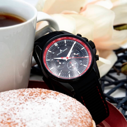 Черный циферблат создает отличный контраст с агрессивным красным безелем, подчеркивая спортивный характер часов и обеспечивая превосходную читаемость времени. Красный цвет добавляет акцент смелости и динамики.