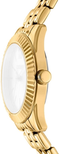 Циферблат золотого цвета создает ощущение тепла и роскоши, а золотистые стрелки и метки обеспечивают четкое и удобное считывание времени. Рельефный безель добавляет часам текстуру и глубину, делая их визуально более интересными и запоминающимися.