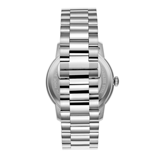 Под прочным минеральным стеклом расположен циферблат серебристого цвета с окошком даты в положении 3 часов. Водозащита 10 Бар позволяет использовать часы при плавании и нырянии без акваланга.