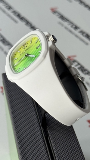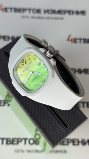 Водозащита 10 Бар позволяет использовать часы при плавании и нырянии без акваланга. Под прочным минеральным стеклом с сапфировым покрытием находится желто-зеленый циферблат с окошком даты в положении 3 часов.