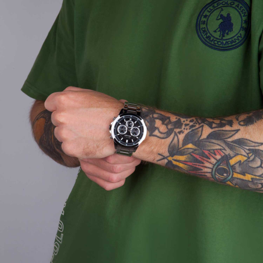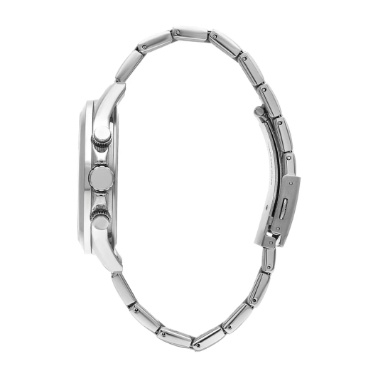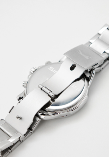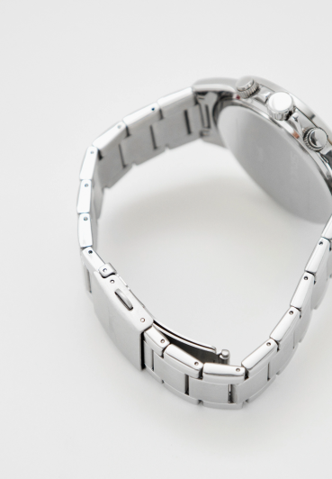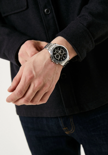 - циферблат с метками в виде штрихов украшен логотипом бренда;