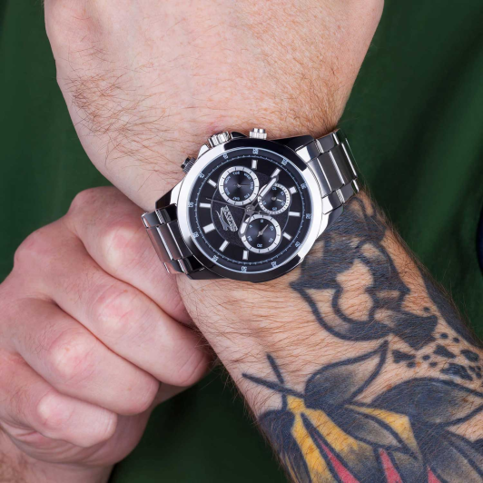 - время в 24-х часовом формате времени, число и день недели отображаются на отдельных циферблатах;